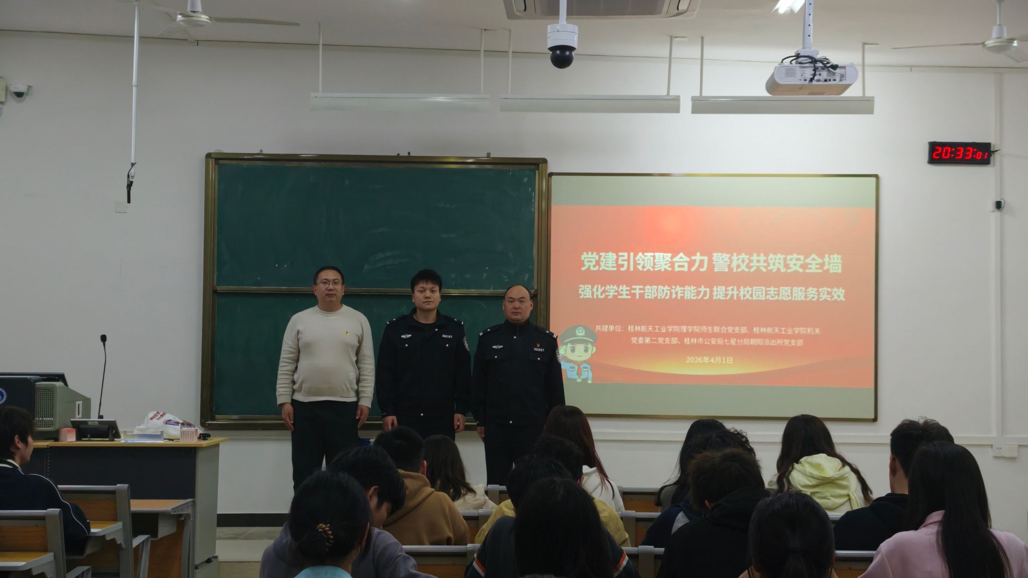 本次活动由理学院师生联合党支部、机关党委第二党支部与桂林市公安局七星分局朝阳派出所党支部联合开展,紧扣“学雷锋·志愿行”主题,聚焦增强大学生干部防诈意识与志愿服务能力。